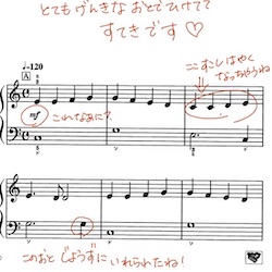 昨年、最初の緊急事態宣言が出たときに、生徒のみなさんがおうちで少しでも、いつもの生活ができるようにと私なりにできることを考えました。オンラインレッスンは諸事情により行いませんでしたが、演奏ビデオを送ってもらい、楽譜にアドバイスを書き込んでお送りするという添削指導のようなことはやっていました。
